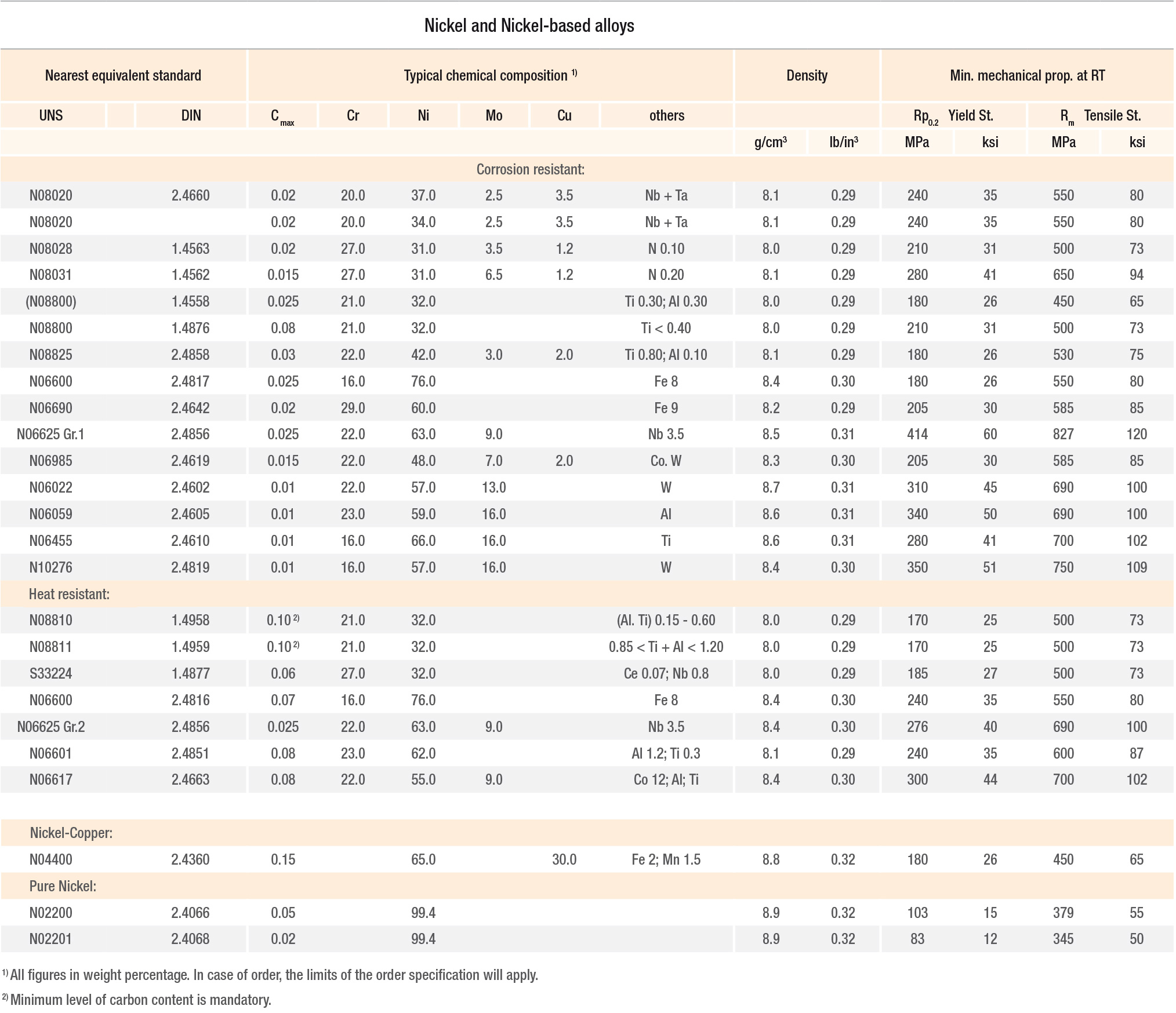 Nickel's high degree of corrosion resistance is due to the fact that it is a relatively noble metal within the galvanic electrochemical series of metals. Adding chromium, molybdenum, copper and other elements to the alloys gives them an even higher resistance to oxidation and corrosion which makes it possible to use them in a wider range of applications. Seamless tubes and pipes made of corrosion resistant nickel alloys are the first choice for a lot of applications due to their excellent resistance to various acids (sulphuric acid, hydrochloric acid, phosphoric acid) and alkaline solutions. A further increase of specific alloy elements (such as chromium, molybdenum, tungsten, titanium, aluminium, niobium, etc.) improves the high temperature, high strength characteristics of austenitic steels. The disadvantage of austenitic stainless steels occurs in the fact that these elements have a reduced solubility. In order to compensate this effect and to reach the desired result, the nickel concentration can be increased. The highest alloyed types of high temperature nickel based alloys contain only a very low iron concentration.